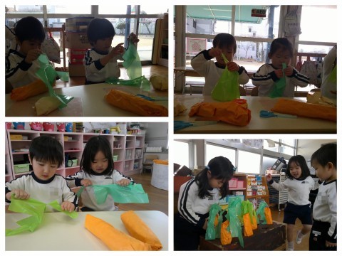 おはなしごっこの後は、ニンジンの葉っぱがないことに気付きつくることにしました。葉っぱをつけて畑のところに持っていくと、本物のニンジン畑のようで大喜びしていましたよ。