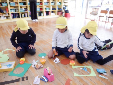 おはなしごっこでは、なりたい役になって遊んでみました。これまで繰り返し遊んできた中で、「今日はウサギさんにしよう!」といろいろな役をする姿や「ぼくはカラスさんがいい!」と一つの役にこだわる姿などが見られます。おはなしごっこの後の振り返りでは、「○○ちゃん、本当のカラスみたいに飛ぶのんじょうずやったよ」「△△くん、じょうずにかくれてた~」などと、友達が頑張っている姿から刺激を受けている様子もうかがえました。3歳児なりに、自分が表現して楽しいと感じるだけでなく、友達の表現にも目を向け始めていることが分かり、うれしく思います。