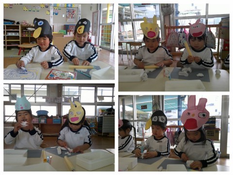 昨日、おめんをつくってお気に入りになったもも組さん。今日は、「おめんをつけておはなしごっこをしたい!」と話す姿もあり、保育室でおはなしごっこを楽しみました。「ウサギさんになって楽しかった!」とおめんをつけることが、とてもうれしくて、より一層なりきって遊ぶ姿が見られました。