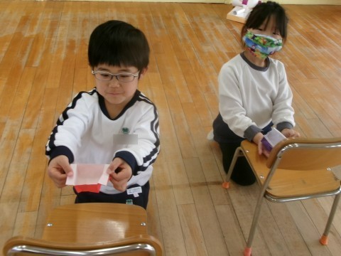 今日は節分の日です。朝、登園してきたら「今日おに来る?」と少し楽しみな子やおどおどした子がちらほらいました。もしも鬼がきた時のために豆を入れ物をおりがみで作りました。完成したら豆をいれて、さあ出発!鬼がでてきたら「おには~そと!」