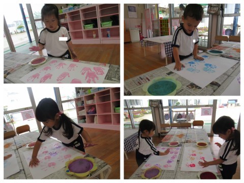 手形で遊べるように絵の具を設えていると、昨日の続きがしたいと遊び始めた子どもたちがいました。その姿を見て、周りの子どもたちも興味をもち、好きな色を選んで手形をして遊びましたよ。昨日もしていた子どもたちはいくつも手形ができることや色の混ざる様子を楽しみ、初めてした子どもたちは手形がつくことにおもしろさを感じたようでした。画用紙一面にステキなもようができましたよ。明日、こいのぼりに変身させようね♪