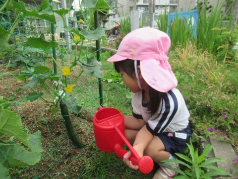 夏野菜の苗を畑に植えてから1か月ほどが経ちました。子どもたちは、毎日お世話をがんばっていて、水やりが日課になっています。今朝、水やりをしに行くと「キュウリできてる~!」と見つけたお友達がいました。トマトの苗の背丈が伸びて自分と同じになっていることに気付き、喜ぶ姿も・・・。夏野菜の生長に気が付いた子どもたちがいたので、クラスのみんなで畑に行ってみると、みんな大喜び!!キュウリ第1号を収穫することができました!