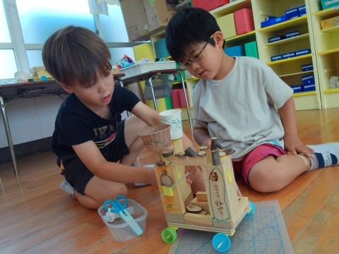「大きい車にしたい」と言っていた子も、今日は考えた見つけた木片をつけていって、イメージしていたように大きくすることができました。