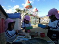 今日は、子どもたちが登園してきて遊び始めるとすぐに土砂降りの大雨・・・☂保育室で思い思いに自発活動を楽しみました。先日つくった魚釣りの続きをしている子どもたち。た~くさんの魚を釣って大喜びです。釣った魚を持って、ままごとの場へ・・・。すると、コンロを使って、魚を焼き始めました(*^▽^*)たくさんの魚を焼いて、魚パーティーをしていましたよ♪遊びと遊びがつながった場面でした。好きな遊びの一角には、指絵の具の遊びの場をつくりました。大きなトレイに絵の具を塗り広げたり、指で描いたりして楽しみましたよ。そしてできた模様を画用紙に写して、スイカをつくりました。まっかっかのおいしそうなスイカができあがりましたよ。