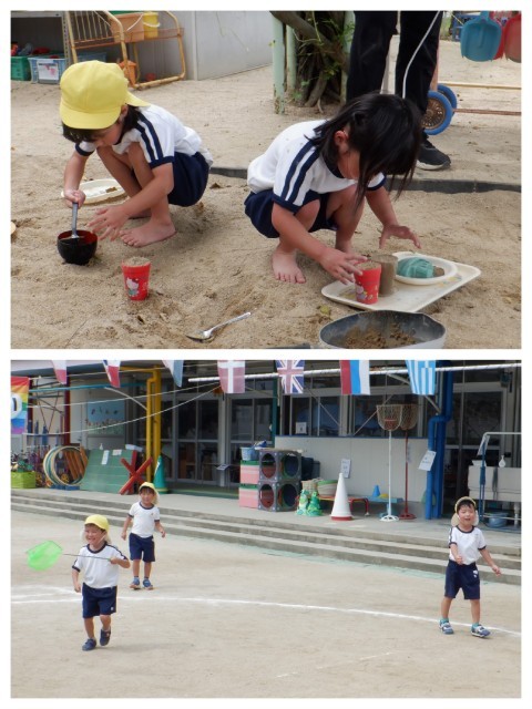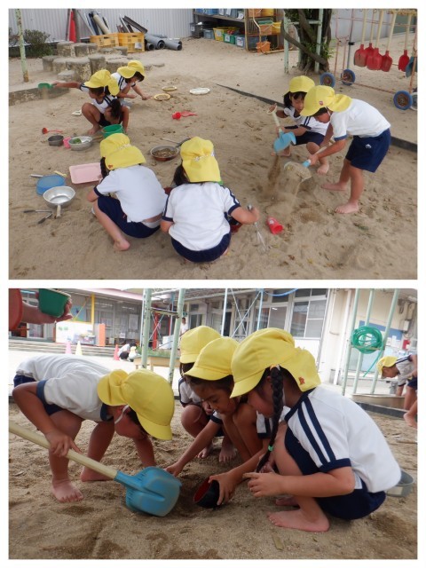 25日 ほっと一息…(4歳児) 公開日 2025/09/25 更新日 2025/09/25 4歳児 予行が終わり、「先生!もう外で遊んできていい?」と早速園庭へとびだしました!朝一番から予行を頑張り、開放されたい気分なのか今日は久しぶりに裸足になって砂場で遊んでいる子ども達が多かったです。遊ぶのだいすき♪遊びって大事だね~(*^^)v