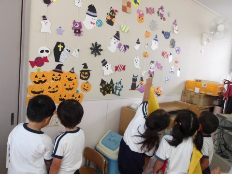 ゆめたまの保護者の皆様がつくってくださったハロウィンの壁面に大喜びだった子ども達です!(^^)!