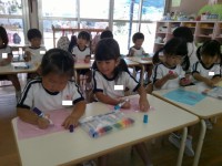 今日は、10月の生活チャレンジカードを配りました。「アカレンジャーいる」「牛乳今日飲んできた」などと、チャレンジカードに興味をもっている子どもたち。“あかレンジャー,”“きいろレンジャー”“みどりレンジャー”に色を塗って3つのグループを意識しやすいようにしましたよ。