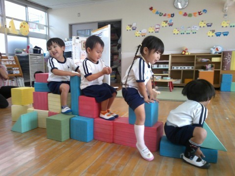 保育室では、好きな遊びを楽しみました。ウレタン積み木を使って遊ぶことが楽しくなってきたもも組さん。ウレタン積み木を並べていくうちに、電車に見立て始めた友達の姿を見て、周りの子どもたちも運んできて、みんなで電車ごっこが始まりましたよ。