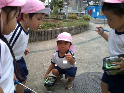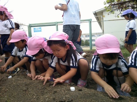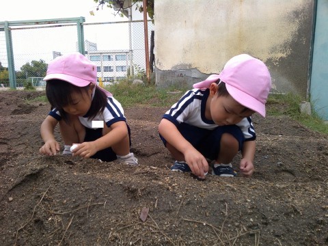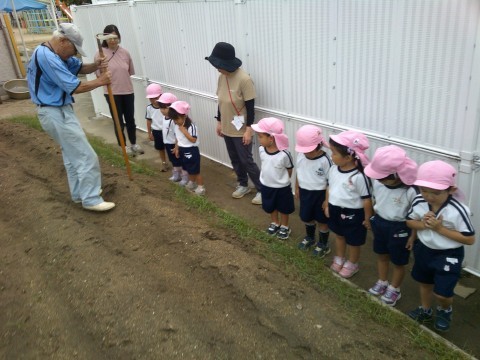 畑には、大根の種をまきました。小さい種を見て、「ちっちゃいなあ」「かわいいなあ」ともも組さん。お世話をしていたら、大根ができることを伝えましたがみんな半信半疑な様子でした。世話をしながら、大根の生長を見ながら、作物ができる様子に興味をもってほしいと願っています。もも組さん、おいしい大根ができるようにお世話をがんばろうね♪