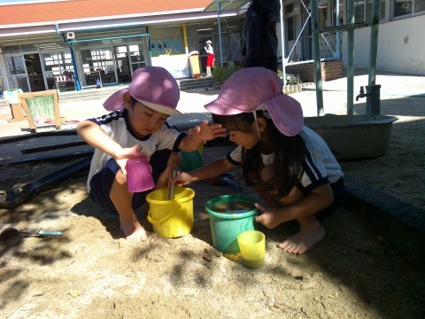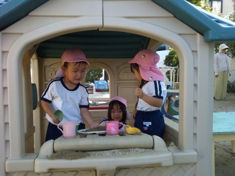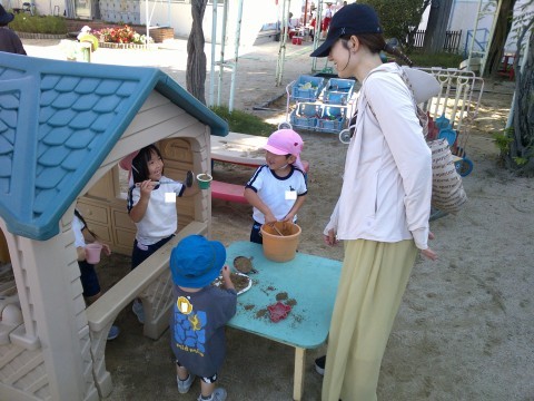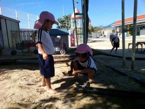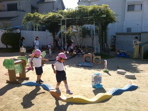 戸外では、虫探しをしたり、砂場でごちそうづくりや道づくりをしたり、のびのびと遊んでいましたよ。運動会で遊んだ木のトンネルや動物たち、クネクネ道で遊ぶ姿もありましたよ。
