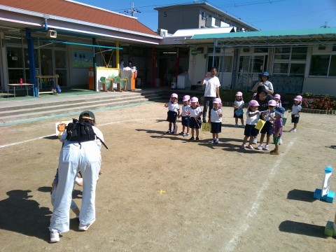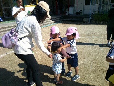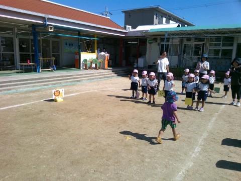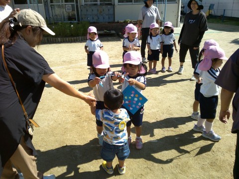 運動会が延期で、昨日の運動会でできなかったお仕事。今日、ひよこ組さん・こりす組さんが幼稚園に遊びに来てくれたので、かけっこの応援をしたり、プレゼントを渡したりしましたよ。かけっこのスタートラインにいるひよこ組さん・こりす組さんに「こっちだよ~!」とやさしく呼んであげたり、そ~っとプレゼントを首にかけてあげたりしていて、もも組さんもおねえさん、おにいさんになってきたなあと感じ、うれしく思いました。