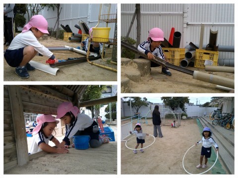 好きな遊びの中では、友達と一緒に樋を組み合わせて道をつくったり、木のおうちの中でサラ砂を見つけてケーキづくりをしたり、フープで遊んでいるすみれ組さんのまねっこをしてみたり・・・。三輪車や固定遊具のチャレンジも、楽しんでいました。朝は、雲っていたので少し肌寒かったですが、元気いっぱい遊びましたよ。