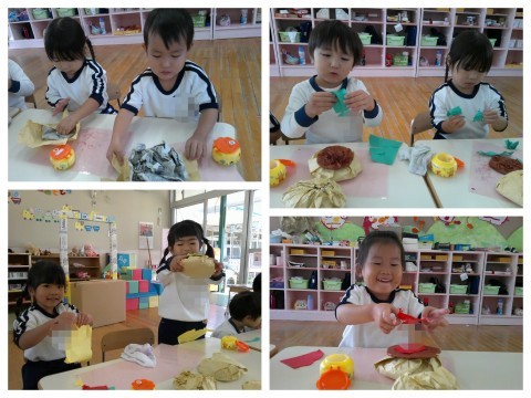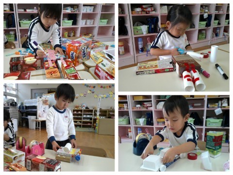 お弁当の後は、材料を使ってつくって遊びました。もも組さんが大好きな遊びでみんな夢中になってつくっています。少し前までは、材料をくっつけることが楽しい姿もたくさんありましたが、「ハッピーセットのおもちゃつくってん」「これ車やで!」「ウサギさんつくった。(手を)パンパンできるよ」などと、つくったものを見立てたり、思いをもってつくったりする姿が見られるようになってきました。「お店屋さんはエプロンつけてるで」「(マクドナルドの店員さんは)赤と黒の帽子かぶってるねん」など、お店屋さんごっこをするために“こんな風にしたいな”というアイディアもたくさんでてきました。つくって遊ぶことの楽しさを感じているもも組さんたちです(*^▽^*)「明日もまたつくれる?」と楽しみにする姿もありますよ♪さまざまな素材にふれながら、つくることの楽しさを感じてほしいと願っています。