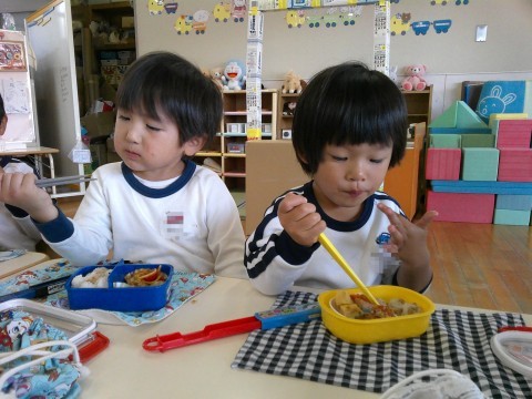 お弁当の時間は、お箸を使って頑張って食べています。おうちの人が、お箸でつかみやすいような内容にしてくださっているので、子どもたちも指先に力を入れて一生懸命お箸を使おうとしていますよ。友達がお箸を使っている姿を見て“お箸を使ってみたい!”という気持ちが出てきているようですよ(*^▽^*)