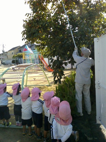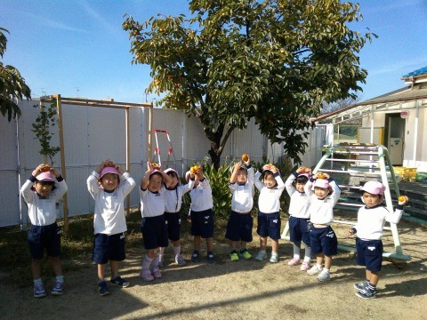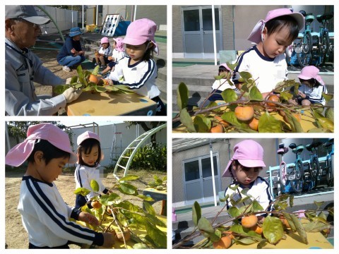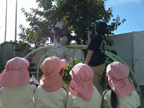 幼稚園のカキの木にたわわに実ったカキの木。たんぽぽ組さんが収穫しているのを見て、「やってみたい!」ともも組さん。たんぽぽ組さんが一人ずつ収穫している様子を見せてもらった後、校務支援員さんにお願いしてもも組さんもカキがいっぱいついた枝を切ってもらって、自分でもぎってみることにしました。クルクルクルっとカキの実を回してみんなじょうずに収穫することができましたよ。