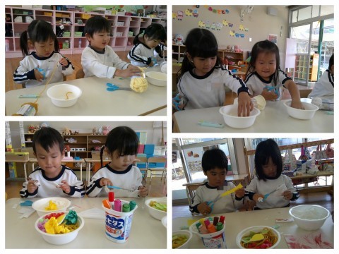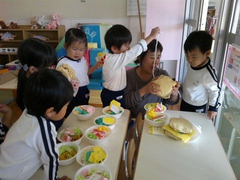保育室では、「うどん大好き!」「ラーメンおいしいで」と言っていた子どもたちがいたので、おいしい麺類をつくりました。「どうやってつくろうかな?」と投げかけると、「白いひもチョキチョキしたらいいやん!」「あそこにあるで!」と言った友達がいて、「それいい!ほんものみたい」と周り子どもたちも大絶賛!!早速つくってみることにしました。1学期は、1回切りをするのが精一杯だったのに、毛糸を切ったり食品トレイに具材の絵を描いて切り抜いたり・・・。はさみをとてもじょうずに使えるようになりました。さまざまな素材にふれながら、そのものの特性に気付いてつくろうとする姿に感心させられます。つくった後は、自分たちがつくったものを使って遊ぶことの楽しさを感じ始め、ごっこ遊びも楽しんでいますよ。