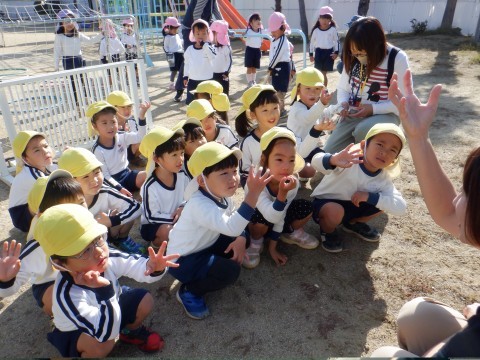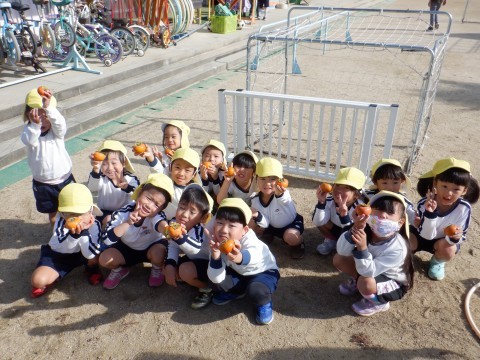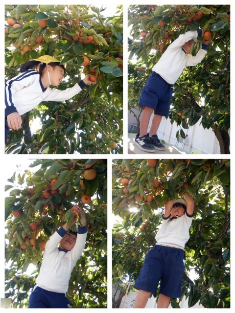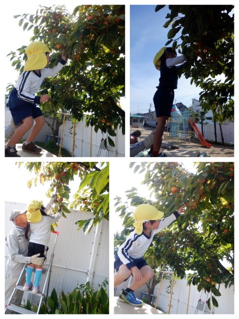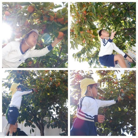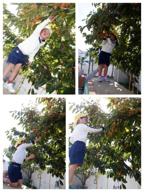 園庭のカキの木のカキが色づきとってもおいしそう♪少し前からカラスや鳥たちが木の上の方のカキを食べているのを子ども達は見ていました。全部食べられちゃう前に、今日はみんなで収穫です!「くるくるくると回してとるんだよ」と話しをしてから、校務支援員さんにも手伝ってもらって一人一つずつカキをとり、お家に持って帰ることにしました。自分で太鼓橋を登って、高い場所のカキがとれると、とっても嬉しそうでした。どんな味がするのかな?また火曜日に教えてね。