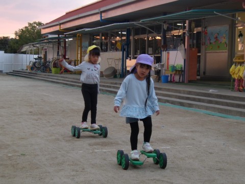 5歳児のお姉さんにあこがれてバランスカーで後を追う4歳児のお友達、近くにそんな存在がいるのはいいですね。
