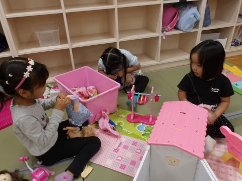 3歳児は大好きな友達と一緒に遊ぶのが楽しみ!ごっこ遊びも「はいどうぞ」「おいしいですか?」などやりとりを楽しんでいます。