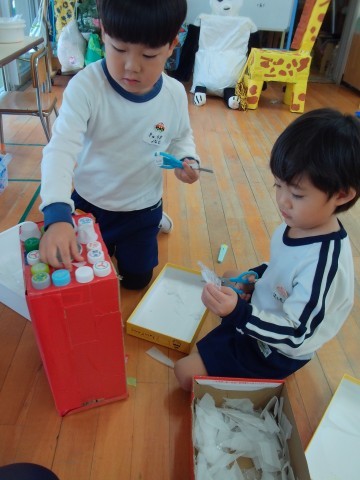 お店屋さんごっこの様子をカット絵として描きました。また、お客さんが楽しめるように看板を作ったり、実際に試して商品を完成したりと自分で工夫する様子が見られました。