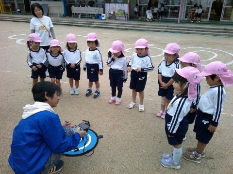 今日は、白鷺幼稚園60周年記念の航空写真撮影をしました。みんな、ドローンが飛んでいる様子を見て大喜び!!ドローンを使ってきっとステキな記念写真を撮影してもらえたことと思います。出来上がりが楽しみですね♪そんな子どもたちがとても興味をもっていたドローン。写真撮影の後、戸外で遊ぼうとしていると、ドローンの片付けをされている途中で、少しだけ近くで見せてもらうことができましたよ。