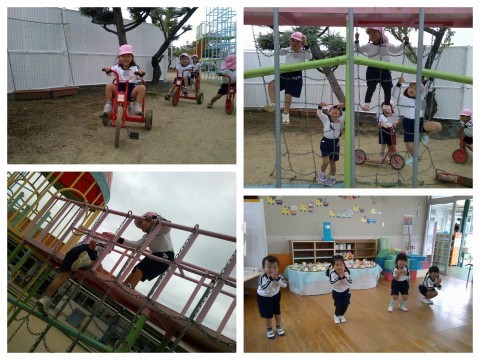その後は、もも組さんだけでのんびりと戸外で好きな遊びを楽しみました。三輪車やスクーターに交代で乗ったり、くさり登りにチャレンジしたりしていました。くさり登りでは、友達がチャレンジしているのを見て、上から「ここ持ったらいいで!」とアドバイスする姿もありましたよ。
