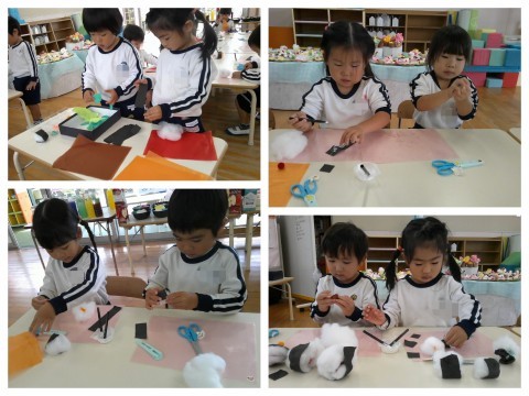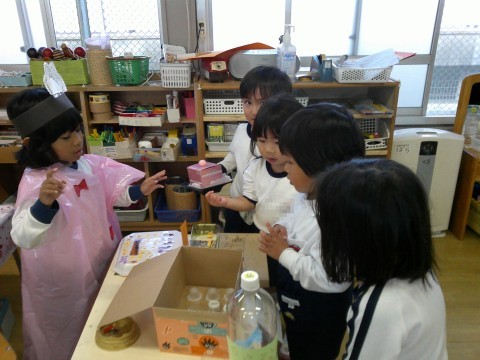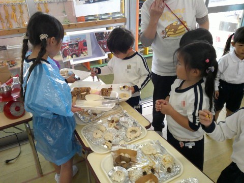 つくって遊ぼうの活動では、今日はみんなが大好きなおにぎりをつくりました。毎週、おうちの人の愛情たっぷりのおにぎりを食べているので、子どもたちは「こんぶおにぎりにするわ」「しゃけおにぎりつくる!」「からあげ入ってるねん」と、大好きな味のおにぎりをどんどんつくっていきました。ぎゅっぎゅっぎゅっと握っている様子がとてもかわいかったですよ。つくった後は、やっぱりお店屋さんごっこ。今日は、お店屋さんとお客さんの2つのグループに分けて遊んでみました。遊んでみた後に子どもたちに話を聞いてみると、「お店の看板早くつけなあかん」「お客さんあんまりこなかった・・・」などと、気付いたことがあったようです。遊んでみて気づくってとても素敵ですね!