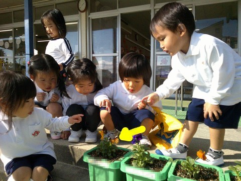 「先生、昨日植えたお花にチョウが止まってる~!!」と降園前に大騒ぎ!!みんなで見に行ってみると、ツマグロヒョウモンチョウがとまっていました。(黄色い矢印の先のオレンジ色のチョウです。)早速、卵を産みに来たのかな?春にたくさんの幼虫に出会えるといいね。気づいたことを先生や友達に知らせようとしたり、周りの友達も興味をもつ姿が見られたりし、自然に興味をもっている姿が見られて、とてもうれしく思います。