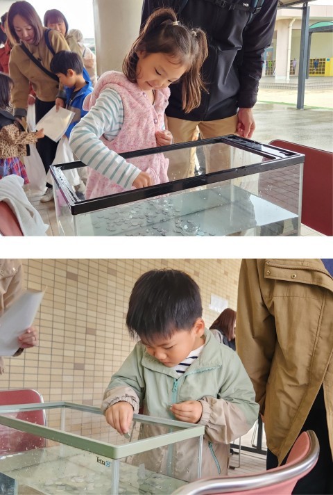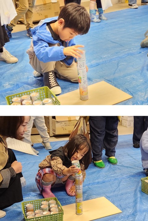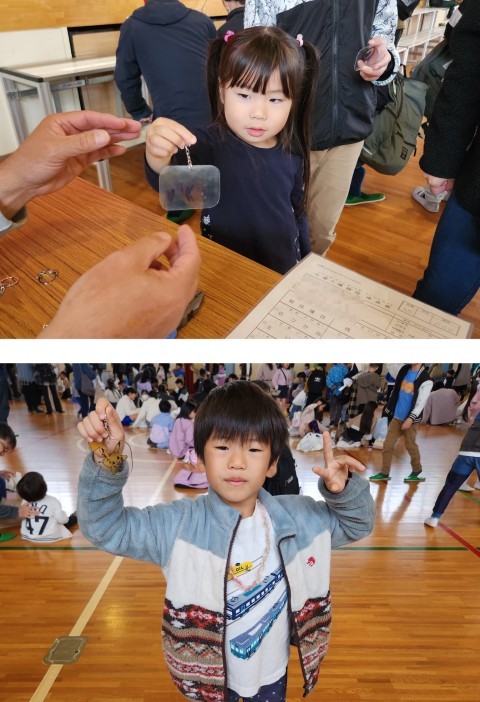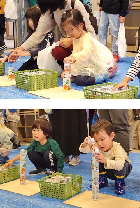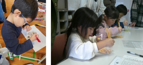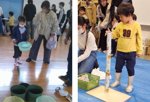 参加したこどもたちは,豆つかみ,玉入れ,タイム計測,空き缶つみ,1円玉おとし,プラバンキーホルダーづくりをそれぞれ楽しみました。