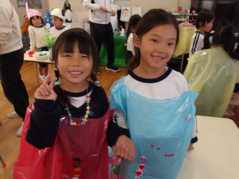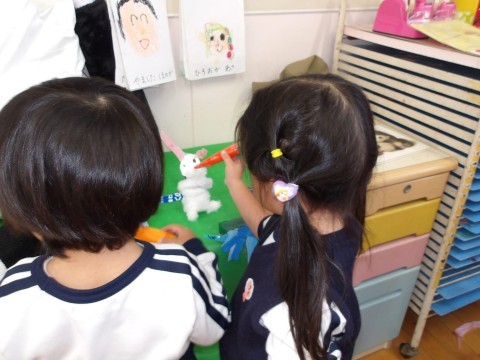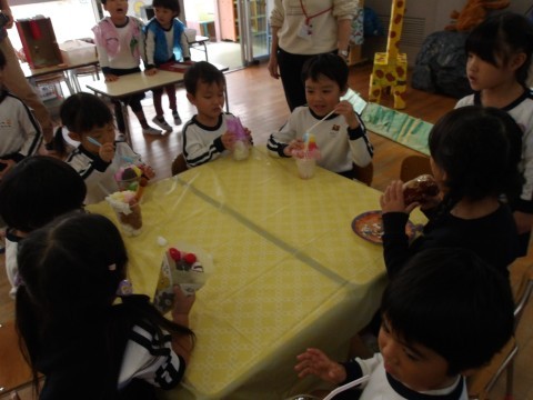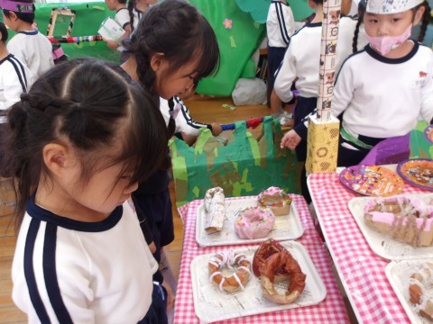 今日はたんぽぽ組さんのお店に行きました!食べ物屋さんのほかにも,昆虫やさんや服やさん,動物園などありました。草むらや池などどこかに隠れている昆虫を必死で探したり,大人の人がつけるアクセサリーやおしゃれな服にわくわくと心が躍っているのが伝わってきました。楽しかった!との声がたくさん聞かれました。また「ドーナツをつかむトングがあったらいい!」「昆虫のいる木をもっと頑丈にしたほうがいい!」「服の首のところをもっと大きく開けたほうがいい!」など気づいたことも積極的に伝えていました。楽しかったね!