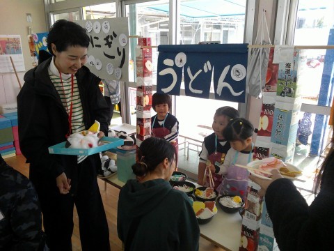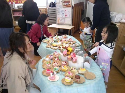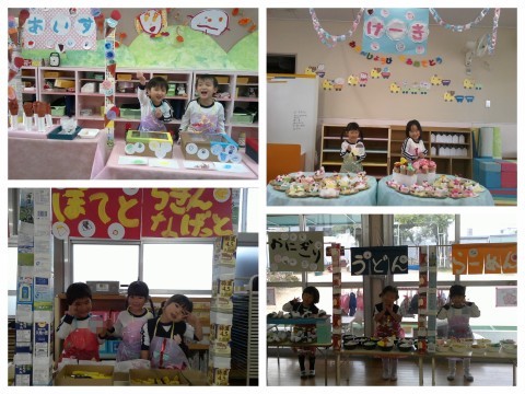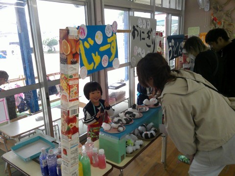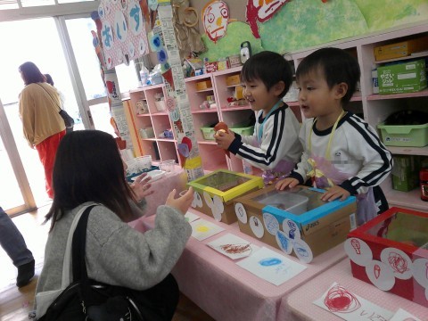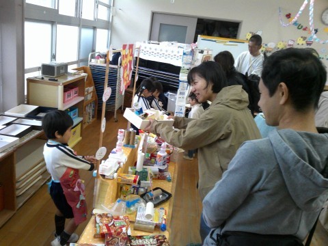 お客さんが来てくれると、「いらっしゃいませ~!」と張り切ったり、「どれがいいですか?」と尋ねたり、品物を渡したりと大忙しです。たくさんのお客さんが来てくれて、にっこり笑顔の子どもたち。自分のおうちの人が来てくれた時は、一段とステキな笑顔になって、自分でつくったごちそうをお勧めする姿もありました。おうちの人も、子どもたちの目線に合わせてやさしいまなざしで包み込んでくださったり、子どもたちが一生懸命、言葉やしぐさで表現しようとする姿に応じてくださったりしたお陰で、子どもたちも楽しいひと時を過ごすことができました。