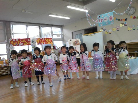 遊んだ後の振り返りでは、「お客さんが来てくれてうれしかったよ」「行列ができてうれしかった」などと、おうちの人が来てくださったことを喜ぶ姿が見られました。おうちの人も「じょうずにつくっていてびっくりしました」「楽しそうにしていてうれしかったです」などと、たくさんほめてくださいました。保護者のみなさま、ありがとうございました。