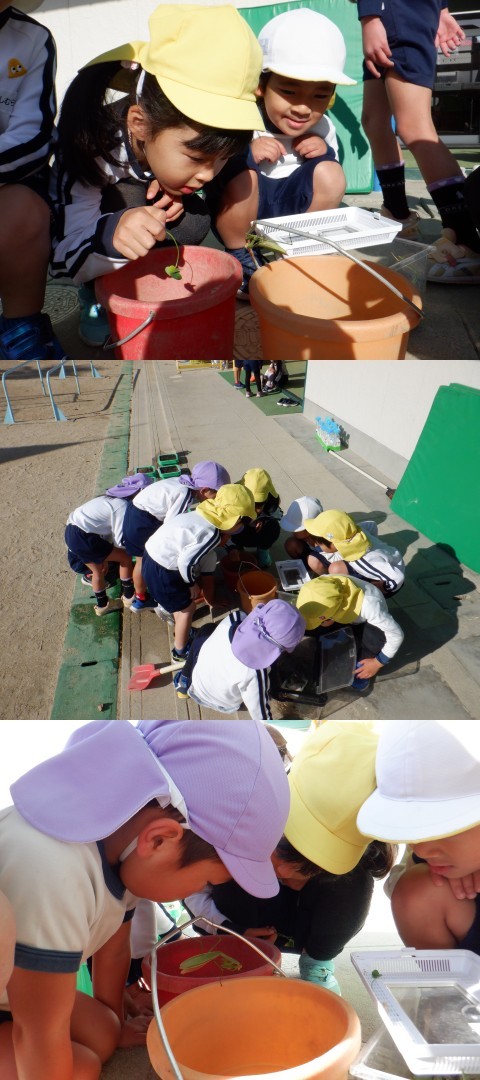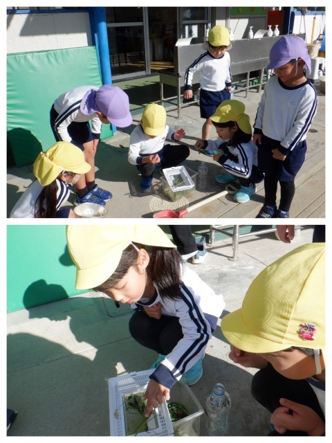 「いいなぁ~」「カマキリかわいいね」とじっくり観察。卵を産んだ後で疲れているのか、動きもゆっくりの為、カマや足、顔までじーっくり見ることができました。途中でバケツの持ちてにぶら下がるようにつかまるカマキリを見て「コアラみたい!」「ナマケモノみたい!」と親近感を持って見ていました。子ども達の表現って的を得ていてとってもかわいいです!春になって、カマキリの赤ちゃんに出会えるのが楽しみだね。