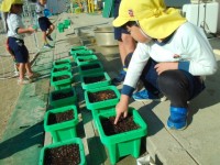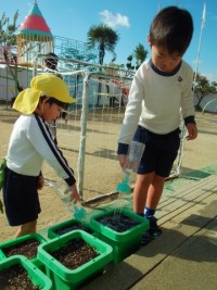 ビオラをもも組とたんぽぽ組で植えました。容器からスッと取り出し、スコップを使って上手に苗を植えていました。