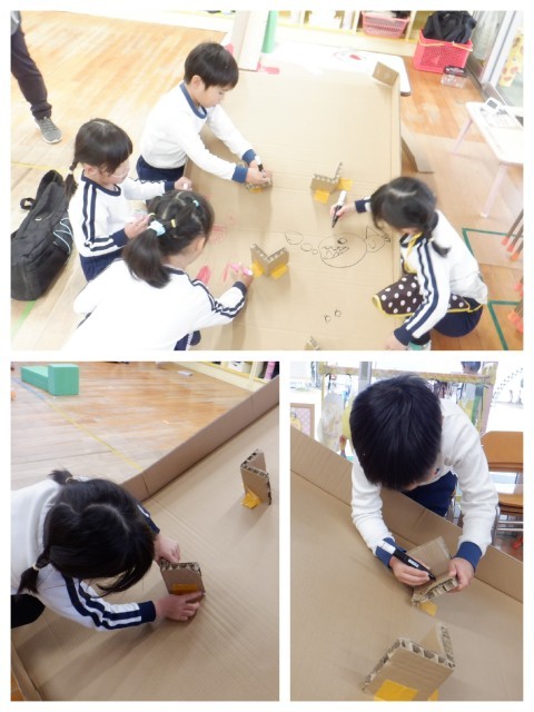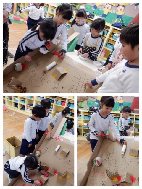 今日は朝から雨だったので、保育室で遊びました。大きな段ボールと段ボール片を見つけて、道をつくり好きな絵をたくさん描いてドングリを転がして遊ぶ子ども達もいました。一気にたくさん転がして色々な所に転がるのを楽しんでいました。