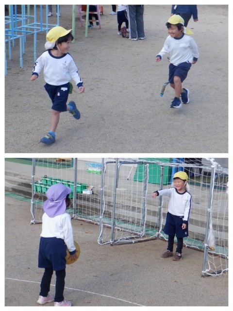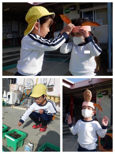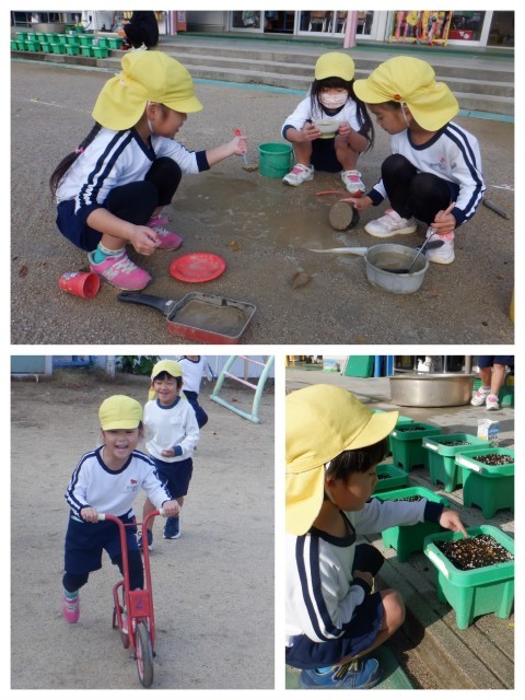 今日は朝から園庭で遊ぶことができて大喜び♪追いかけっこをしたり、みずたまりのどろんこでままごとをしたり、きれいな落ち葉を拾ったりして楽しんでいました。自分の好きなことを、友達と一緒に楽しめるって素敵だね!
