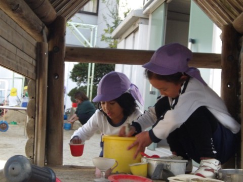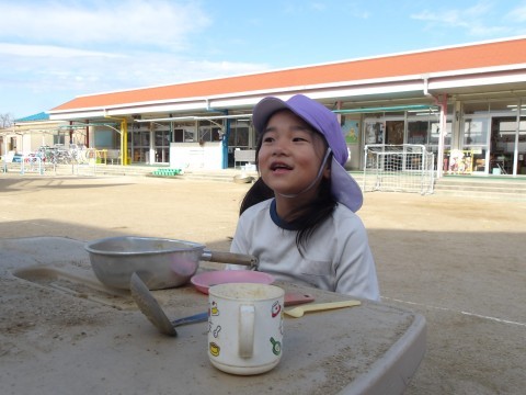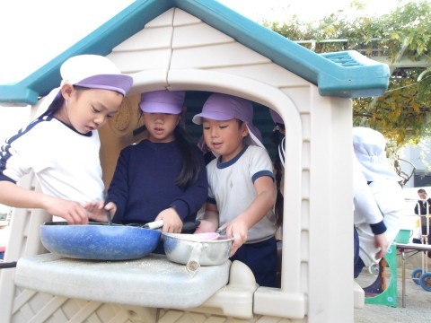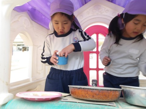すみれ組 遊びの様子です。本日もイメージを共有しておいしいご飯やスイーツを作ったり,キックボードやらしっぽとりなどの鬼ごっこをして園庭を元気に走り回っていました。
