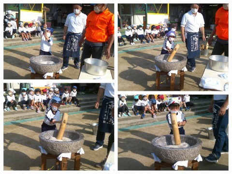 今日は、昨日から楽しみにしていたもちつきがありました。いつもと違う雰囲気の幼稚園にちょっとドキドキしながら、ちんからでもち米を蒸してくださっているところを見たり、いろいろな道具に興味をもったりしていましたよ。お手伝いをしてくださる地域の方やPTA役員、保護者の方々が、子どもたちのためにと準備をしてくださっている様子を見ながら、どんどんわくわくした気分に♪朝の身支度を終えると、テラスに出て、お手伝いの方々やすみれ組さんが、もちをついている様子を見て興味津々!!「ぺったん ぺったん」という掛け声が聞こえてくると、もも組さんも一緒になって杵を持ったつもりで「ぺったん ぺったん・・・」と一緒に掛け声を言いながら応援していましたよ。