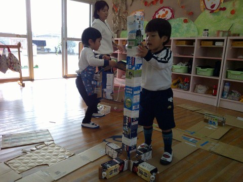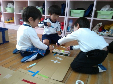 先日つくった車の続きでは、ライトやハンドルをつけたり、車が走る道をつくったり、信号をつくったりと、どんどんアイディアが出てきます。段ボール板をつなぎあわせていって、曲道をつくったり、道をつないでぐるぐる回れるようになったりしました。同じ場で遊びながら、一人一人がいろいろなアイディアを思いついてつくっていますよ。