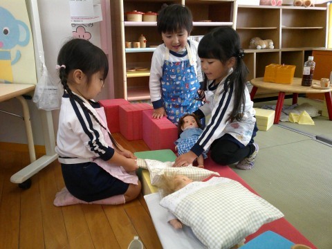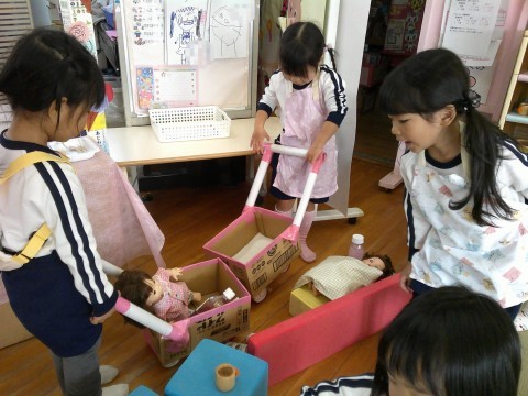 赤ちゃんのお世話ごっこでは、赤ちゃんのご飯をつくったり、病院ができたり、お散歩に行ったり・・・。生活に密着した子どもたちのごっこ遊びが、一人一人のイメージで広がったり、友達との関わりの中からまた新たな遊びが生まれたりしています。