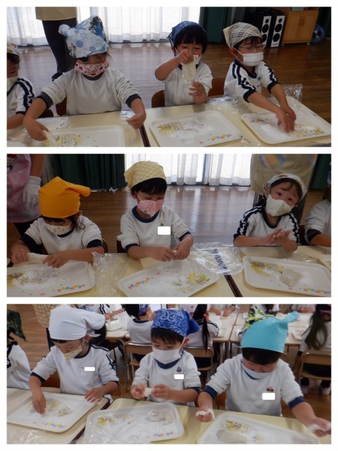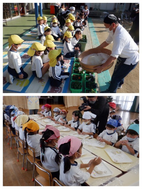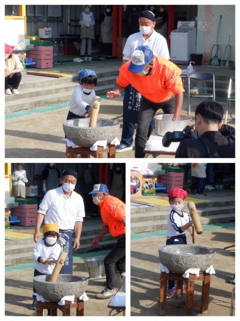 楽しみにしていた『おもちつき』がありました。地域の方が最初についてくれているのを見ていると、ペッタンペッタンといい音が聞こえてきます。「あれ(杵)重そうやな~」「じいじ、がんばれ~!!」とお友達のおじいちゃんを応援する姿もありました。できあがったおもちを見せてもらうと、「おいしそう!」「ぴかぴかしてる♪」とますますもちつきが楽しみに♪