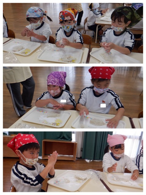 小さくても子ども達にとっては重い杵をしっかりともって、みんな上手につくことができました。自分たちがついたおもちを丸めるのもとっても嬉しそうでした。自分でついて丸めたおもちは特別おいしいと思います。しっかりと加熱して家族みんなでおいしく食べてくださいね。どんな風にして食べたのか、また明日教えてね!