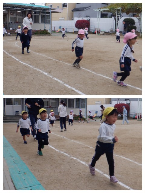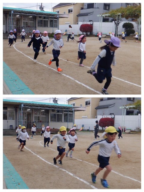 今朝はみんな9時10分のスタートに間に合いました☆頑張ったね。もも組さんは、初めてのかけ足でしたが、途中で止まったり歩いたりしないで、ゆっくりでも走り続けるというお約束を守って頑張っていましたよ。明日から気温がグッと下がるそうです。寒さに負けず、毎朝遅刻しないでかけ足頑張ろうね!