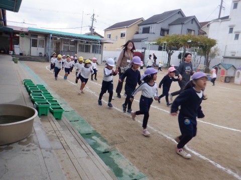 今日から朝のかけ足が始まりました!!登園後9時10分からスタートなので、9時ギリギリに登園してしまうと大慌てで朝の身支度をしないといけません。