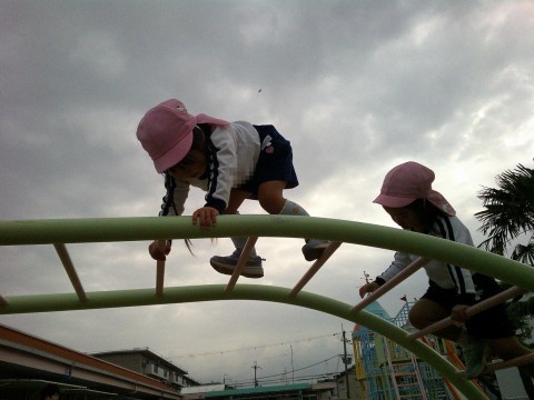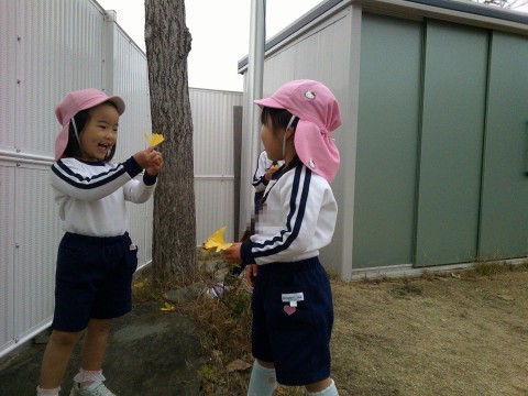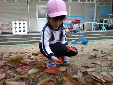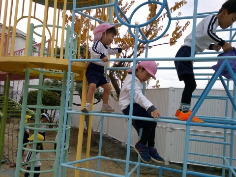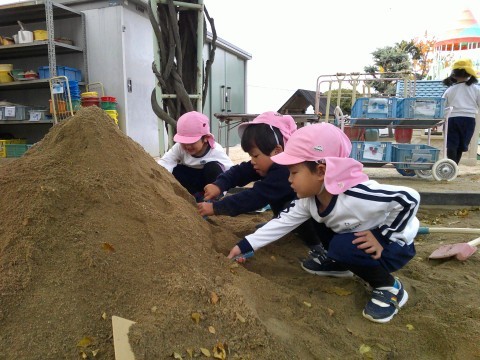 今日から、かけ足が始まりました。子どもたちは、どんなことをするのかとわくわくしていたようで、朝の身の回りの始末もとてもがんばっていましたよ。走ることが大好きなもも組さんなので、かけ足もとても楽しかったようですよ。身体が温まった後は、砂場でトンネルづくりをしたり、きれいな落ち葉を見つけたり、固定遊具にチャレンジしたりと、好きな遊びを楽しみました。風が吹いて昨日までよりも寒くなりましたが、かけ足で身体が温まっていたので「寒い~」という声が聞こえることなく、元気いっぱい遊びました。