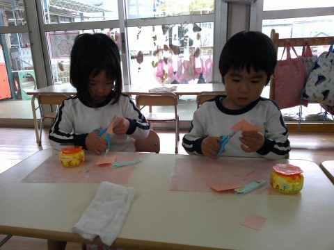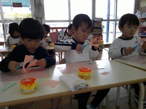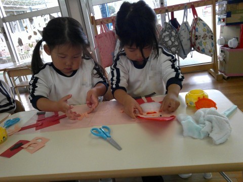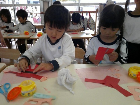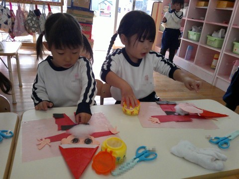 いっぱい遊んだ後は、保育室でサンタさんづくりの続きをしました。先日、サンタさんの顔をつくったので、今日はサンタさんの体をつくることにしました。まず初めにみんなにサンタさんの手をつくることを投げかけてみると、「パーをつくったらいい」という話になりました。○を切った後、細長く切った紙を貼りながら、「パーになってきた~」と喜んでつくっていましたよ。画用紙を半分に切って張り合わせて服をつくったり、靴に見立てたりして、かわいいサンタさんができました。サンタさんが完成すると、「トナカイさんもつくりたいなあ♪」と子どもたち。つくることがとても大好きなようです。楽しい雰囲気を感じながら、いろいろなものをつくることを楽しんでほしいと思います。