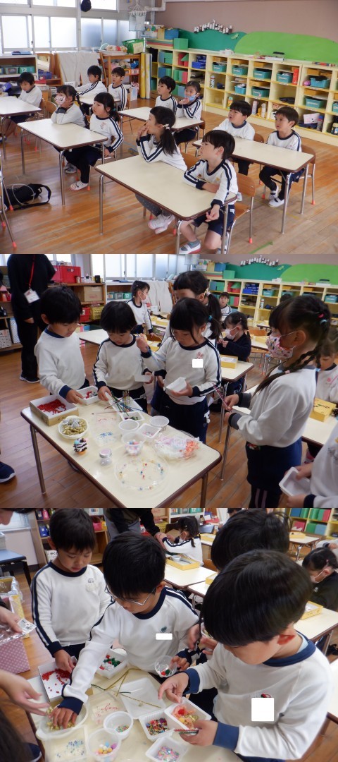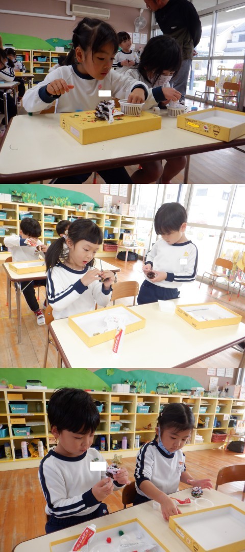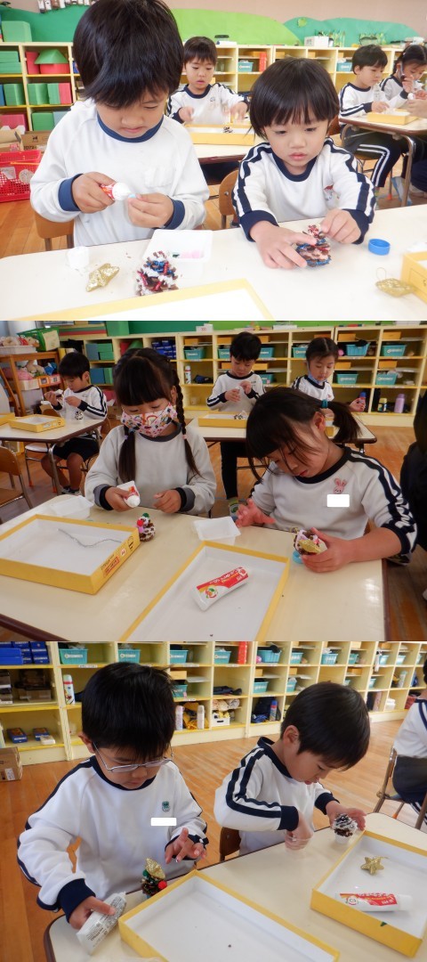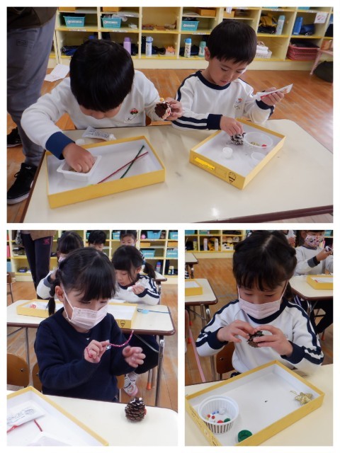 まつぼっくりに毛糸やモールを巻き、自分で選んだビーズやフワフワボールなどをつけて、かわいいツリーをつくりました。毛糸を巻いていくとまるで雪みたいで「見て見て!かわいい」と喜び、キラキラのモールを巻いた子は「ツリーが光ってる☆本物みたいやろ?!」と嬉しそう♪小さなまつぼっくりにボンドをつけたり、小さなビーズをのせたりするのは少し難しいですが、集中して頑張っていました。たくさんのかわいいツリーができあがり🎄飾るのが楽しみだね。