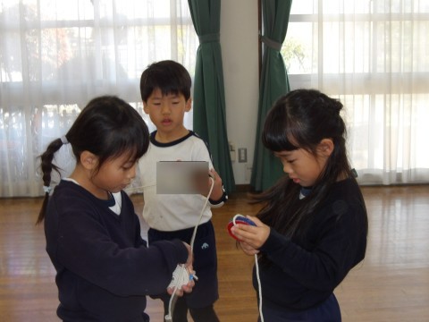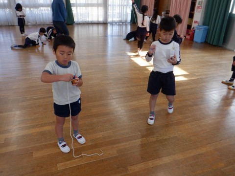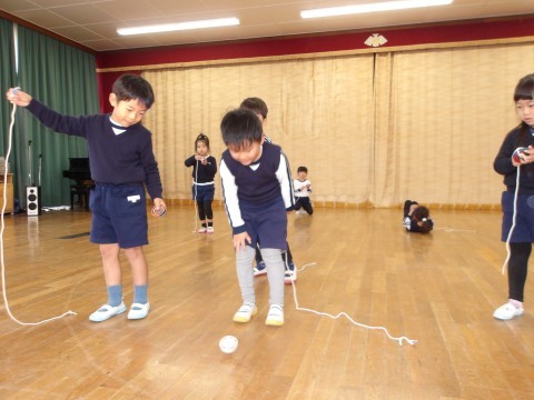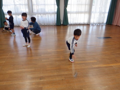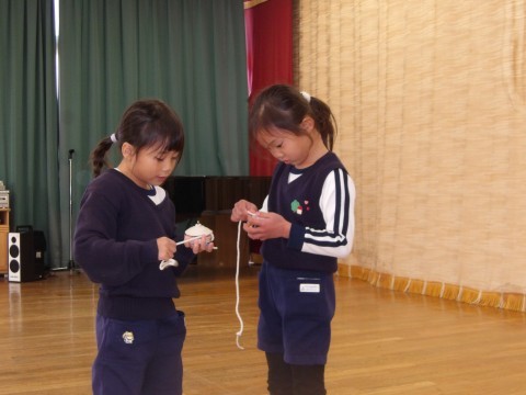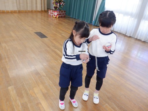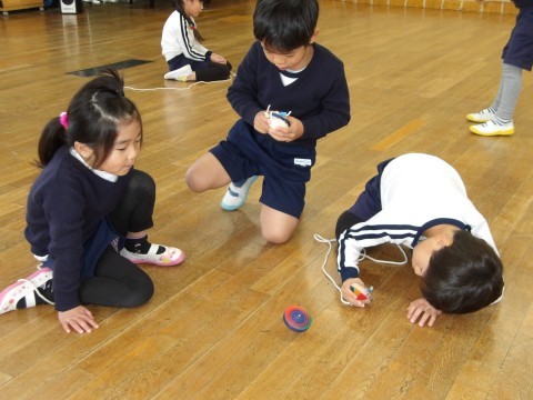 遊びの時間が終わるとさっそく子ども達から「こま回ししよう!」とリクエストがありました。昨日サンタさんからもらったこまで遊びたくてしかたありません。広い遊戯室でみんなでこま回しをしました。「こま回せる」と言っていた子も始めはなかなか思うように回らずでしたが,子ども師匠に教えてもらいだんだん回せる子が増えてきました。こま回しのコツは,初めに二回まいてしたから,自分のペースで巻いて,こまを投げたらひもを手前にひくとよいそうです。