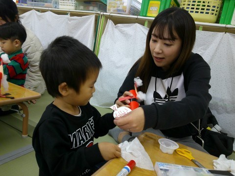 お母さんと一緒にはさみを使って三角のサンタさんの帽子も作りました。みんなとても上手にはさみも使えていましたね。