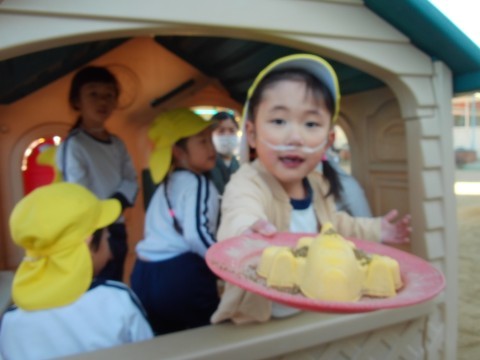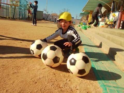 また、普段使っているボールよりも少しかためのボールを使って投げたり蹴ったりして楽しむ姿が見られました。砂場で遊ぶ様子はよくありましたが、お友達と協力してお山を作ったり掘ったりと楽しむ姿が最近見られました。ひみつきちでも、掘る場所を指示するリーダーがいたり2つのスコップで素早く掘る子がいたりと様々です。それぞれが作り上げたものをつなげて遊ぶ楽しさに少しずつ気づきはじめています。
